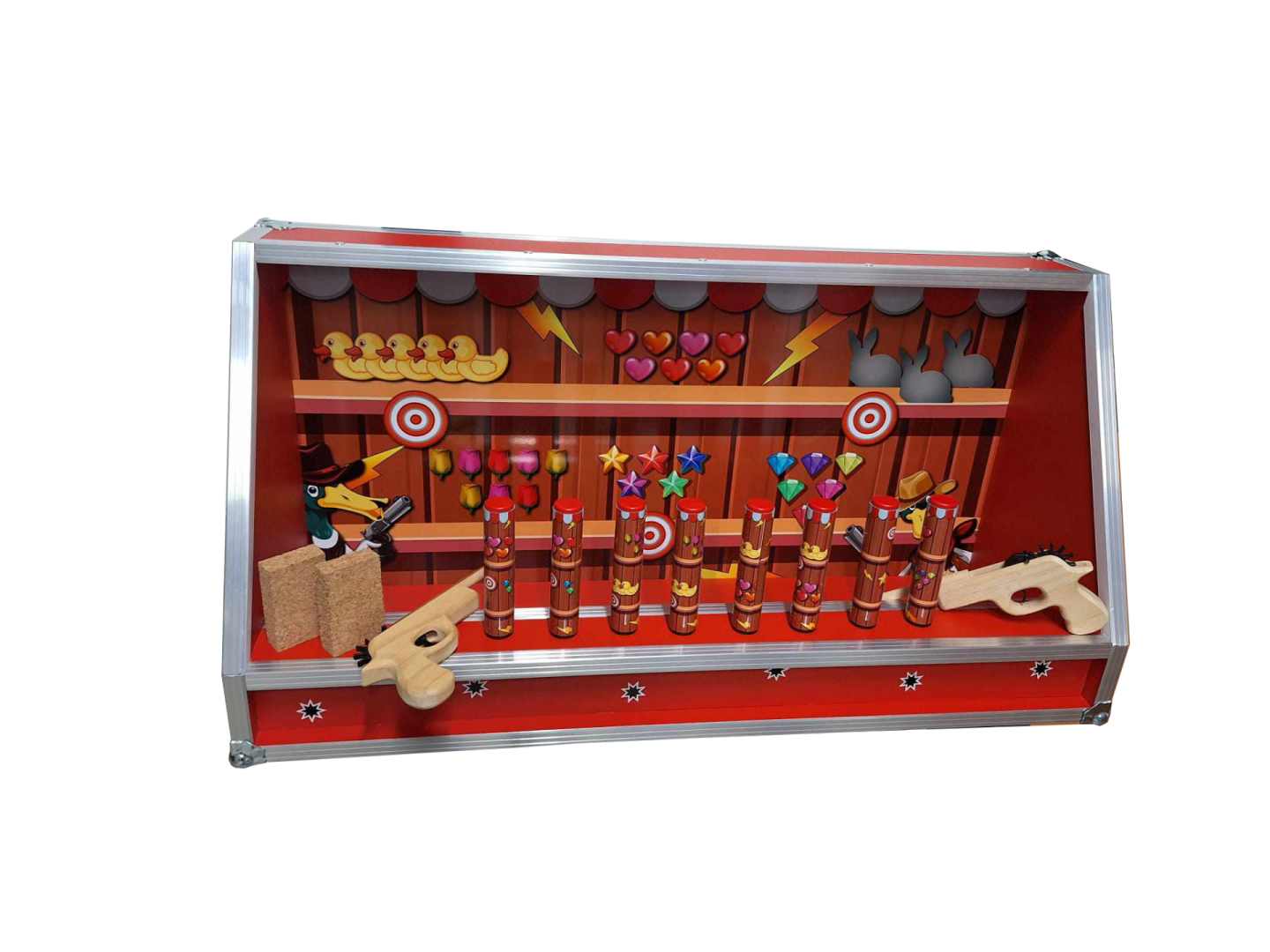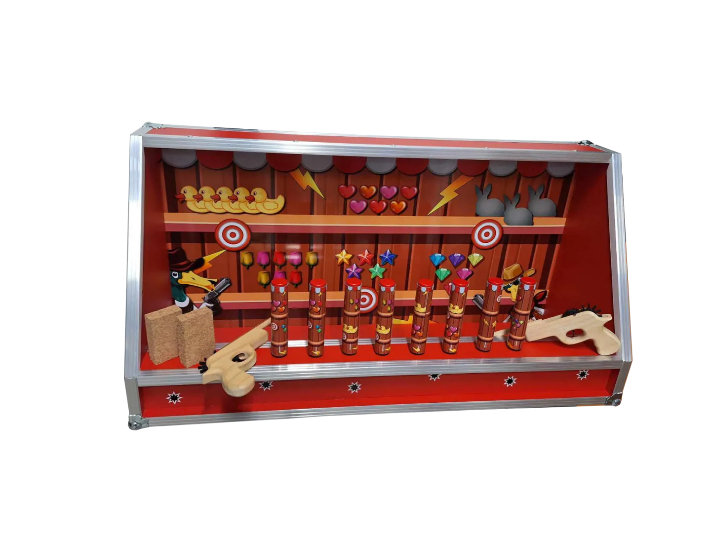 De elastiekpistolen schiettent is een groot succes op ieder feestje, kinderpartijtje of buurtactiviteit. Deze kermisklassieker brengt de sfeer van de oude jaarmarkt meteen naar je eigen tuin of evenement. Spelers proberen met een elastiekpistool de opgestelde doelen omver te schieten, precies zoals bij een echte schiettent op de kermis.