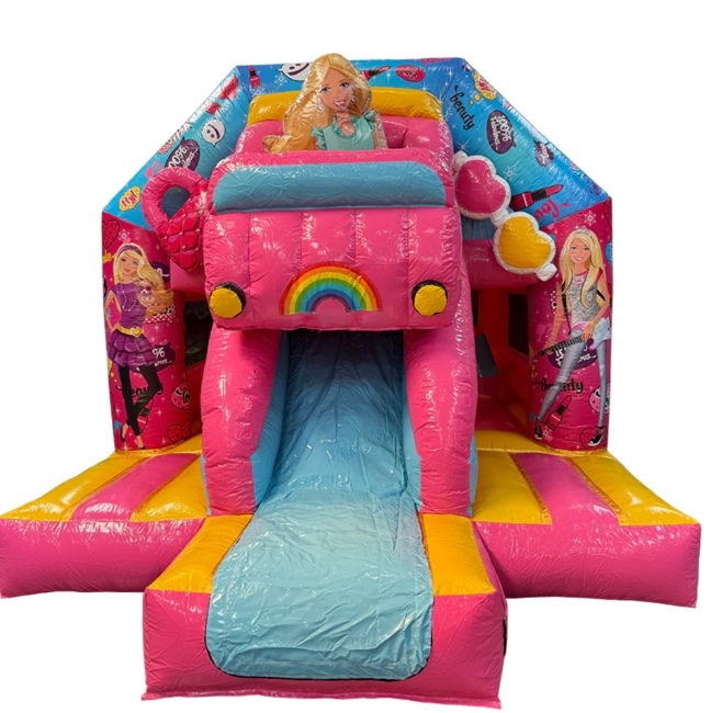 Huur het kleurrijke Springkussen Barbie (6,5 x 4m) met glijbaan, 3D-figuren en obstakels voor max. 12 kinderen. Compleet geleverd met blower, grondzeil en verankeringsmateriaal. Vanaf € 115,00 per dag incl. btw.